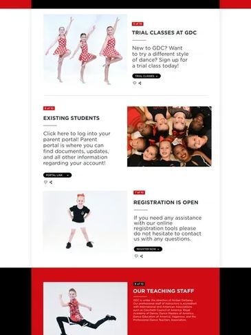 Diverging from a generic approach, GDC used professional images from recitals and individual pictures of dancers to create carousel ads. The themes ranged from “This Season is Going to Be Out of This World” to “Select Your Character.” These campaigns had a dual benefit: they showcased the talents and diversity of GDC students and allowed parents to share specific slides featuring their children, effectively multiplying the reach.