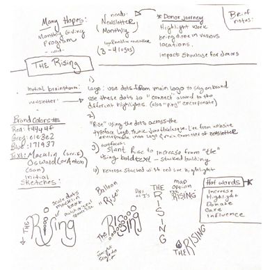 Initial sketches include project details as well as initial design sketches to explore marks, and typography. Color would not be introduced until the final stages.